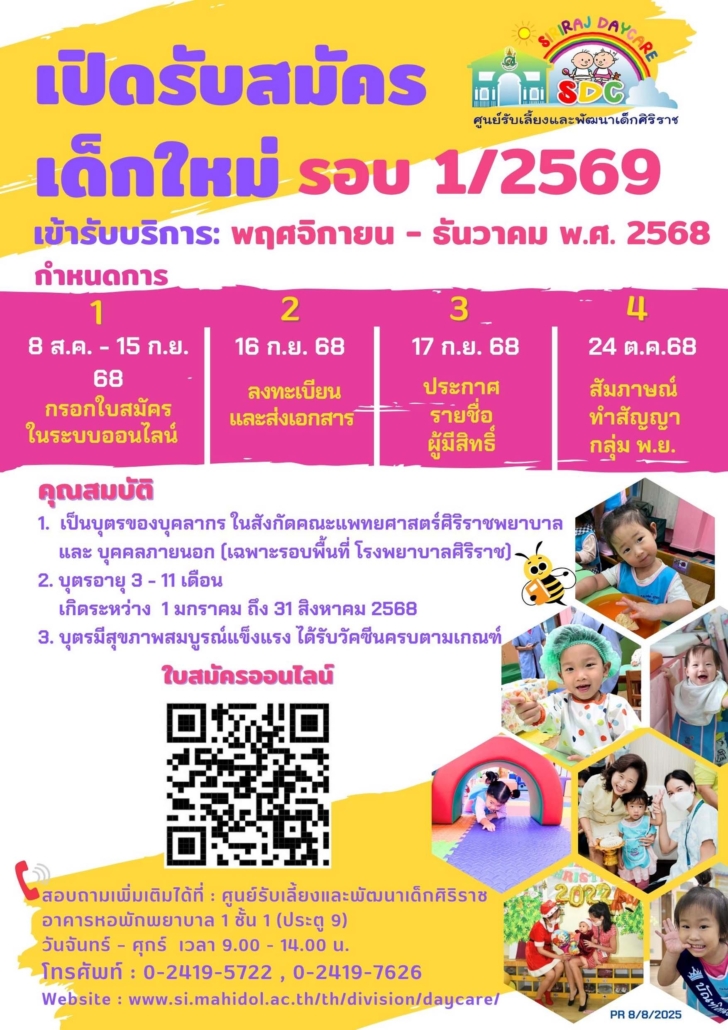 ศูนย์รับเลี้ยงและพัฒนาเด็กศิริราช  เปิดรับสมัครบุตรของบุคลากร ที่มีอายุ 3 – 11 เดือน เข้ารับบริการรับเลี้ยงบุตรของบุคลากรคณะแพทยศาสตร์ศิริราชพยาบาล รอบ 1 / 2569 ในรอบเดือนพฤศจิกายน – ธันวาคม 2568 คลิกดูรายละเอียด
