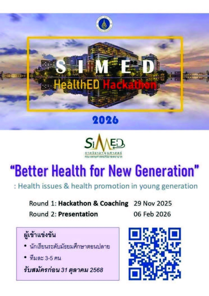 ภาควิชาอายุรศาสตร์ ขอเชิญผู้สนใจเข้าร่วมการประชุม Siriraj Medicine Hackathon ในวันที่ 6 กุมภาพันธ์ 2569 ณ ห้องประชุมวีกิจ วีรานุวัตติ์ ตึกอัษฎางค์ ชั้น 4 คณะแพทยศาสตร์ศิริราชพยาบาล