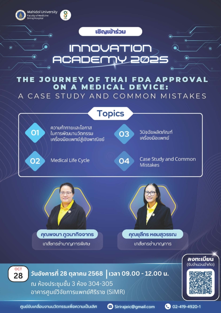 ศูนย์ขับเคลื่อนงานนวัตกรรมเพื่อความเป็นเลิศ (SiEIC) ขอเชิญเข้าร่วมฟังบรรยาย Innovation Academy 2025 หัวข้อ ” The Journey of Thai FDA approval on a Medical Device: A Case Study and Common Mistakes” ในวันที่ 28 ตุลาคม 2568 เวลา 09.00 – 12.00 น. ณ ห้องประชุม ชั้น 3 ห้อง 304-305 ศูนย์วิจัยทางการแพทย์ (SiMR) คณะแพทยศาสตร์ศิริราชพยาบาล