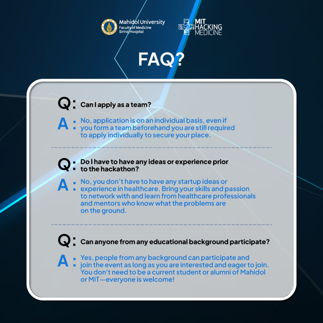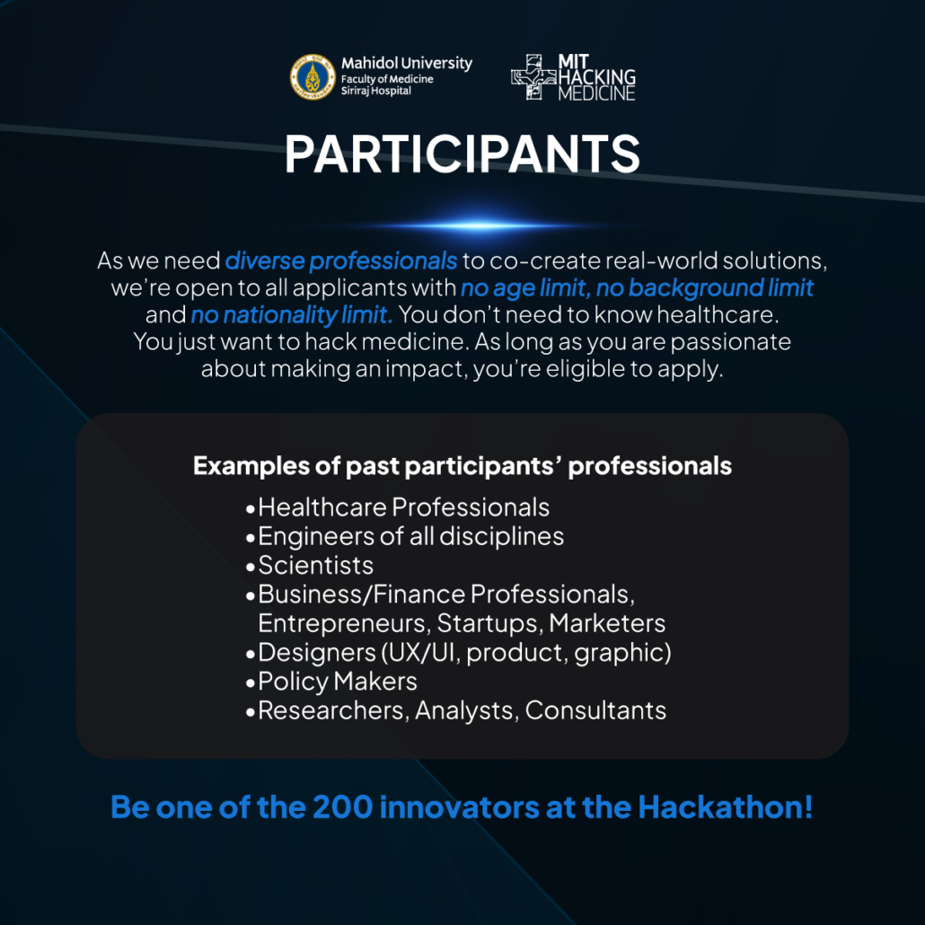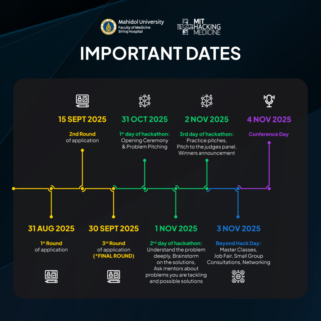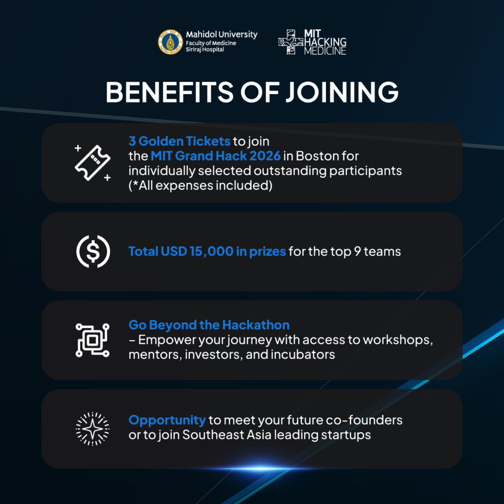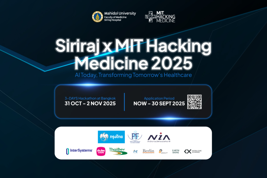 ณะแพทยศาสตร์ศิริราชพยาบาล ม.มหิดล ร่วมกับ หน่วยงาน MIT Hacking Medicine จากสถาบันเทคโนโลยีแมสซาชูเซตส์ (Massachusetts Institute of Technology หรือ MIT) ขอเชิญเข้าร่วมกิจกรรม “Siriraj x MIT Hacking Medicine” รูปแบบของการแข่งขันนำเสนอโซลูชันและนวัตกรรมด้านระบบสุขภาพ (Hackathon) ภายใต้หัวข้อ Chronic Disease และ Mental Health ระหว่างวันที่ 31 ตุลาคม – 4 พฤศจิกายน 2568 ณ คณะแพทยศาสตร์ศิริราชพยาบาล ม.มหิดล