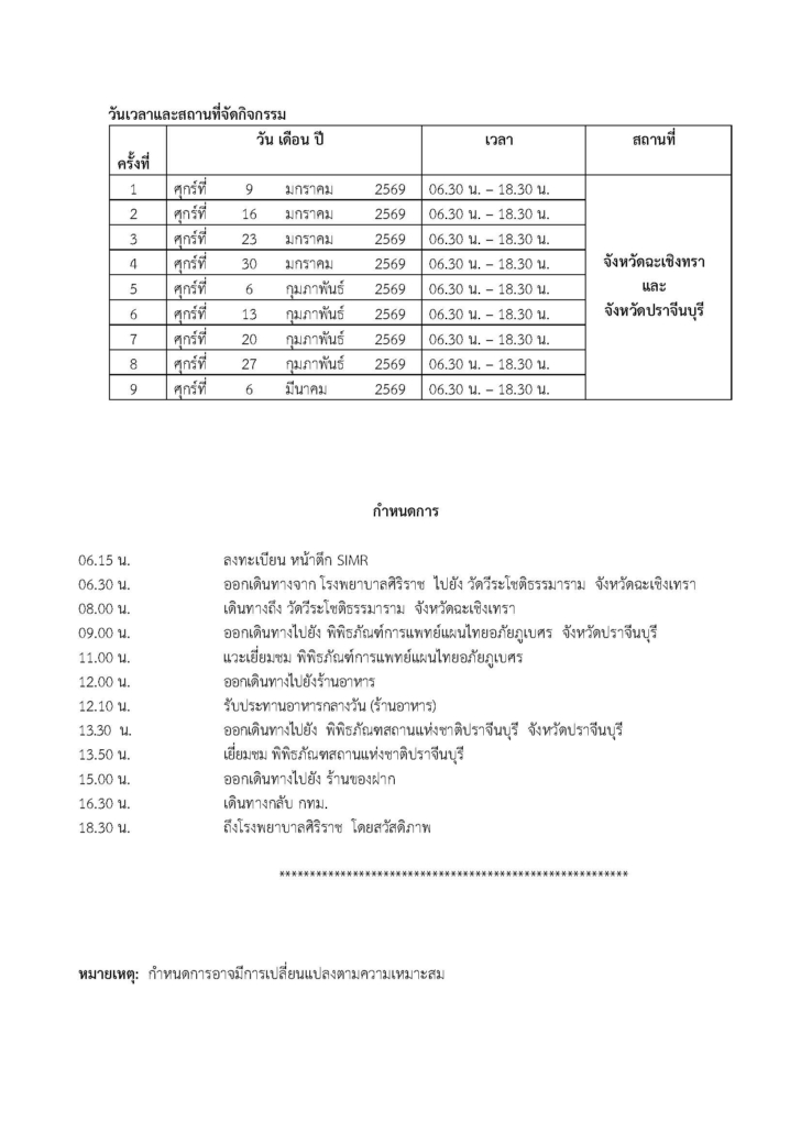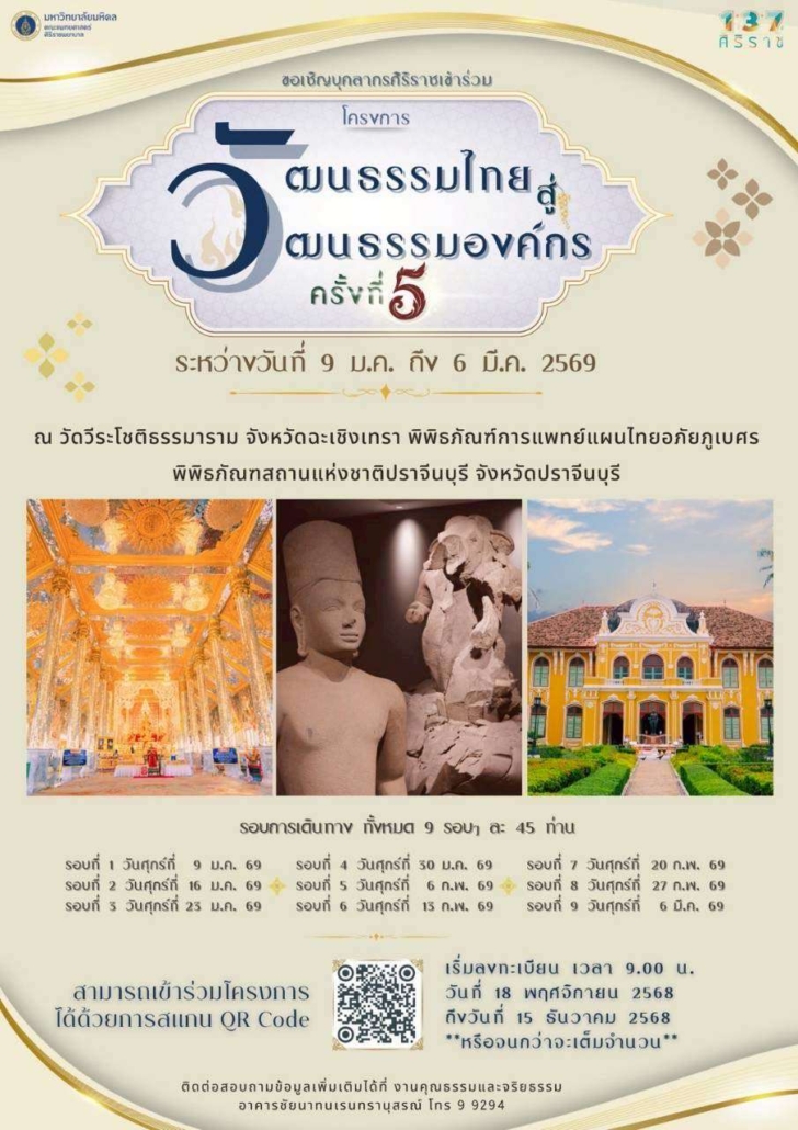 งานคุณธรรมและจริยธรรม คณะแพทยศาสตร์ศิริราชพยาบาล ขอเชิญบุคลากรเข้าร่วมกิจกรรม “โครงการวัฒนธรรมไทย สู่วัฒนธรรมองค์กร”ครั้งที่ 5 ระหว่างเดือนมกราคม – มีนาคม 2569 ณ จังหวัดฉะเชิงเทราและจังหวัดปราจีนบุรี