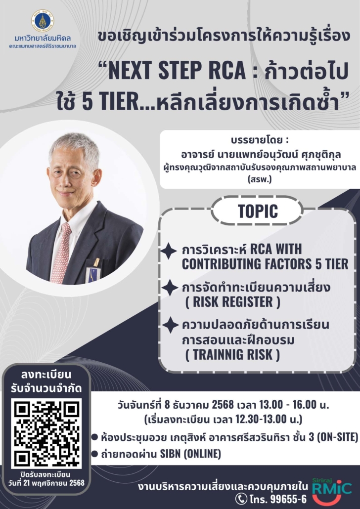 งานบริหารความเสี่ยงและควบคุมภายใน ขอเชิญบุคลากร เข้าร่วมโครงการอบรมให้ความรู้ หัวข้อ “Next Step RCA : ก้าวต่อไป ใช้ 5 Tier…หลีกเลี่ยงการเกิดซ้ำ”  วิทยากรโดย อาจารย์ นายแพทย์อนุวัฒน์ ศุภชุติกุล ผู้ทรงคุณวุฒิจากสถาบันรับรองคุณภาพสถานพยาบาล (สรพ.) ให้เกียรติมาบรรยาย ในวันที่ 8 ธันวาคม 2568 เวลา 13.00 – 16.00 น. ณ ห้องประชุมอวย เกตุสิงห์ อาคารศรีสวรินทิรา ชั้น 3 คณะแพทยศาสตร์ศิริราชพยาบาล
