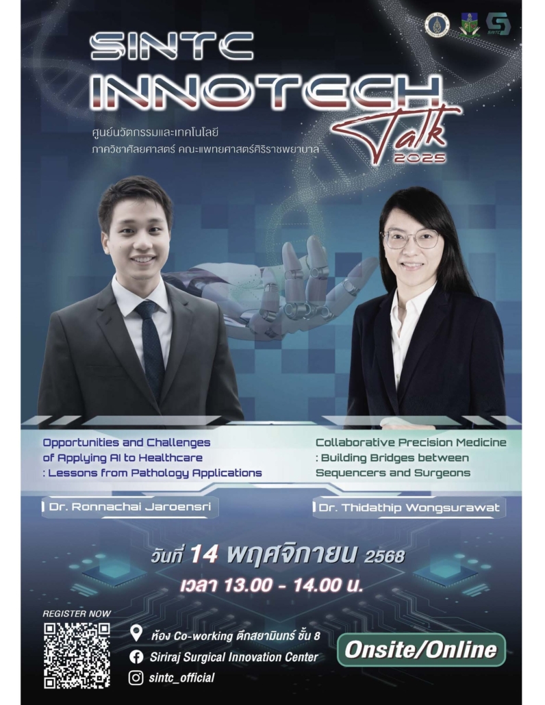 ภาควิชาศัลยศาสตร์ ร่วมกับ ศูนย์นวัตกรรมและเทคโนโลยีศัลยศาสตร์ ได้จัดงาน SiNTC INNOTECH Talk 2025 หัวข้อ Opportunities and Challenges of Applying AI to Healthcare: Lessons from Pathology Applications และ Collaborative Precision Medicine: Building Bridges between Sequencers and Surgeons ในวันศุกร์ที่ 14 พฤศจิกายน 2568 เวลา 13.00 – 14.00 น. ณ ห้อง Co-working ศูนย์นวัตกรรมและเทคโนโลยีศัลยศาสตร์ ตึกสยามินทร์ ชั้น 8 หรือผ่านช่องทางออนไลน์