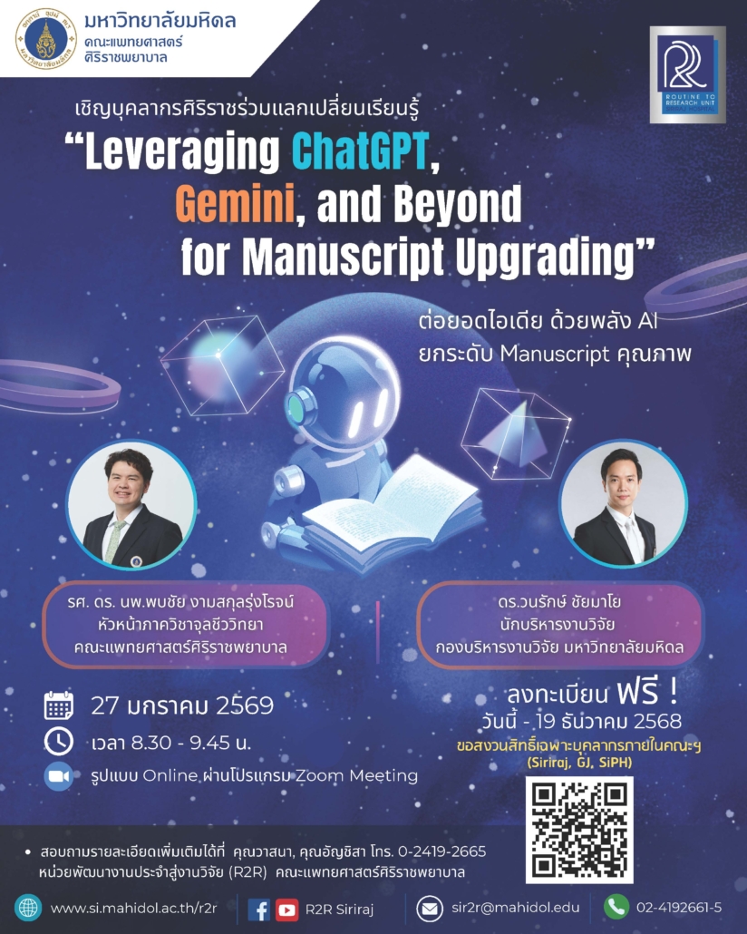 หน่วยพัฒนางานประจำสู่งานวิจัย (R2R) งานกลุ่มวิจัยและเครือข่ายวิจัย ฝ่ายวิจัย ขอเชิญบุคลากรคณะแพทยศาสตร์ศิริราชพยาบาล (Siriraj, GJ, SiPH) เข้าร่วมฟังการเสวนาแลกเปลี่ยนเรียนรู้ หัวข้อ “Leveraging ChatGPT, Gemini, and Beyond for Manuscript Upgrading” ในวันจันทร์ที่ 27 มกราคม 2569 เวลา 08:30-10:15 น. ทางโปรแกรม Zoom