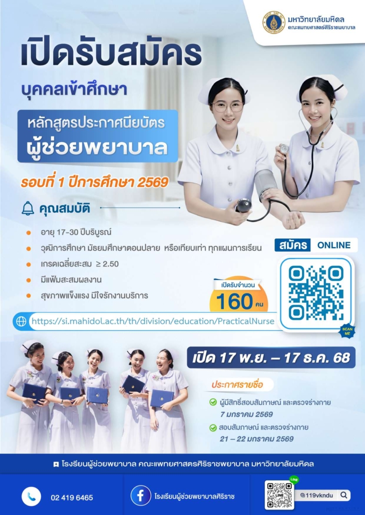 โรงเรียนผู้ช่วยพยาบาล คณะแพทยศาสตร์ศิริราชพยาบาล เปิดรับสมัครบุคคลเข้าศึกษาในหลักสูตรประกาศนียบัตรผู้ช่วยพยาบาล ปีการศึกษา 2569 (รอบที่ 1)