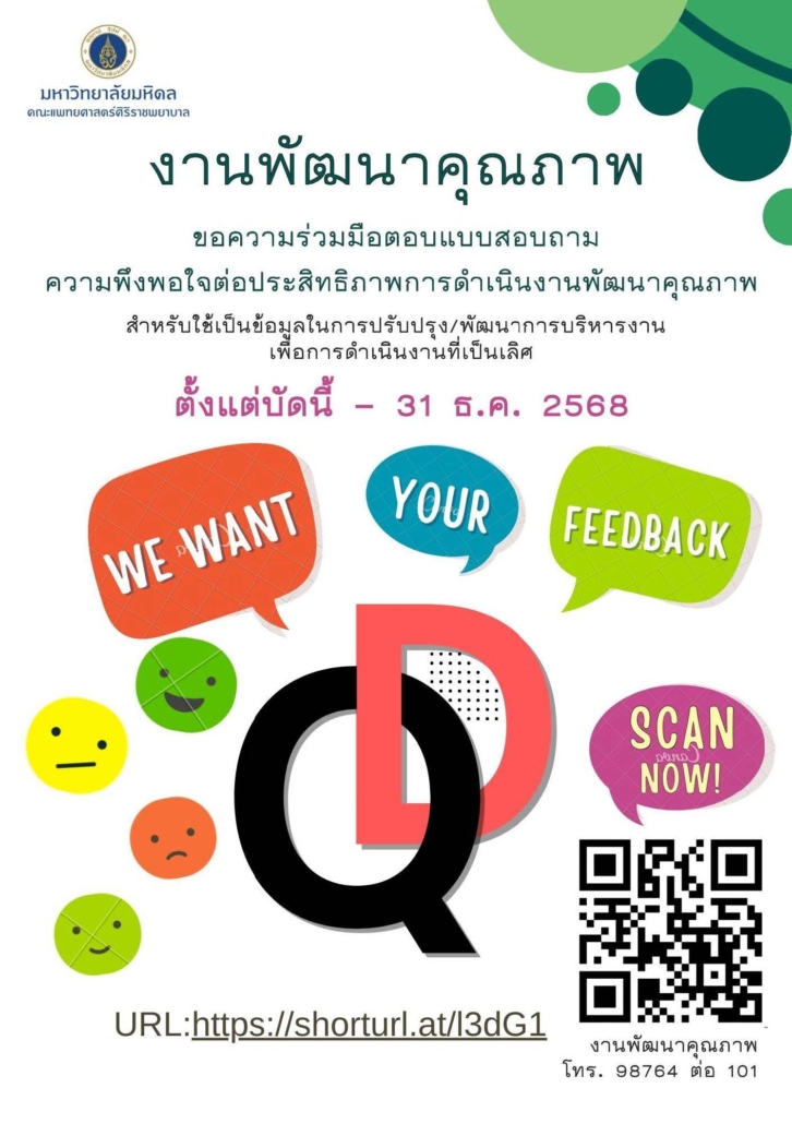 งานพัฒนาคุณภาพ ขอเชิญบุคลากร/หน่วยงานภายในคณะ ฯ ร่วมตอบแบบสำรวจความคิดเห็นต่อการให้บริการของงานพัฒนาคุณภาพ คณะแพทยศาสตร์ศิริราชพยาบาล ประจำปี พ.ศ. 2568 ตั้งเเต่วันที่ 1 – 31 ธันวาคม 2568 สำหรับใช้เป็นข้อมูลในการปรับปรุง/พัฒนาการบริหารงาน เพื่อการดำเนินงานที่เป็นเลิศ