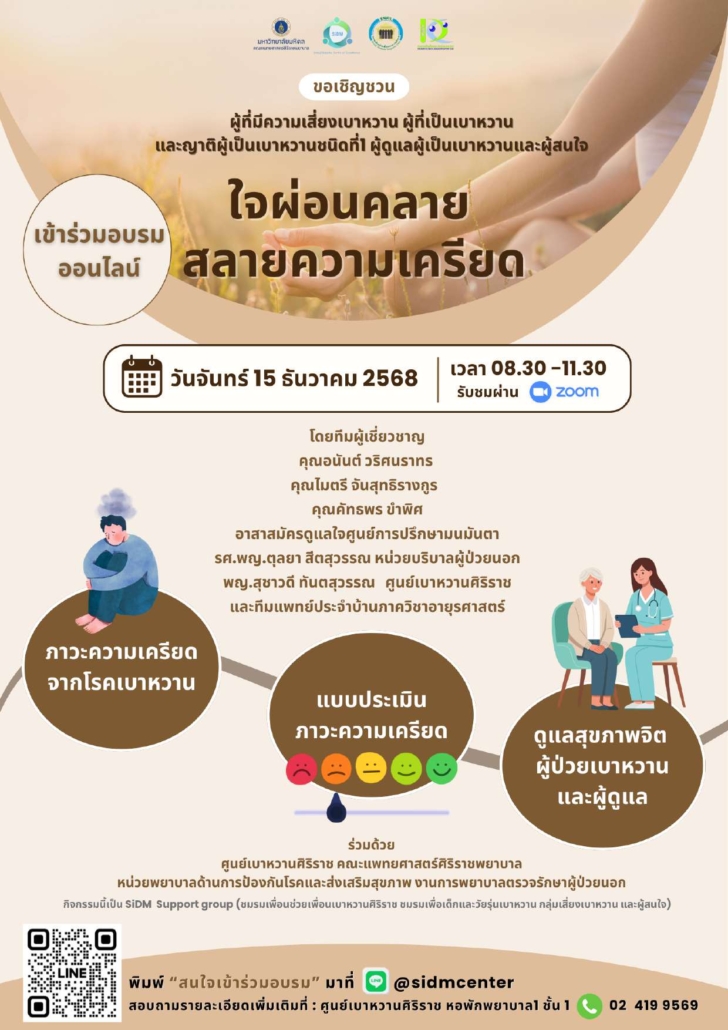 ศูนย์เบาหวานศิริราช ร่วมกับ สาขาวิชาการบริบาลผู้ป่วยนอก ภาควิชาอายุรศาสตร์, หน่วยพยาบาลด้านป้องกันโรคและส่งเสริมสุขภาพ งานการพยาบาลตรวจรักษาผู้ป่วยนอก ฝ่ายการพยาบาล, สาขาเวชศาสตร์การกีฬา ภาควิชาศัลยศาสตร์ออโธปิดิคส์และกายภาพบำบัด ขอเชิญผู้ที่มีความเสี่ยงเบาหวาน ผู้เป็นเบาหวาน ญาติ และผู้ดูแลผู้เป็นเบาหวาน รวมถึงผู้ที่สนใจเข้าร่วมอบรมกิจกรรม Si Support Group “ใจผ่อนคลาย สลายความเครียด” ในวันจันทร์ ที่ 15 ธันวาคม 2568 เวลา 08.30 – 11.30 น. ผ่านช่องทาง zoom application (ไม่มีค่าใช้จ่ายในการอบรม)