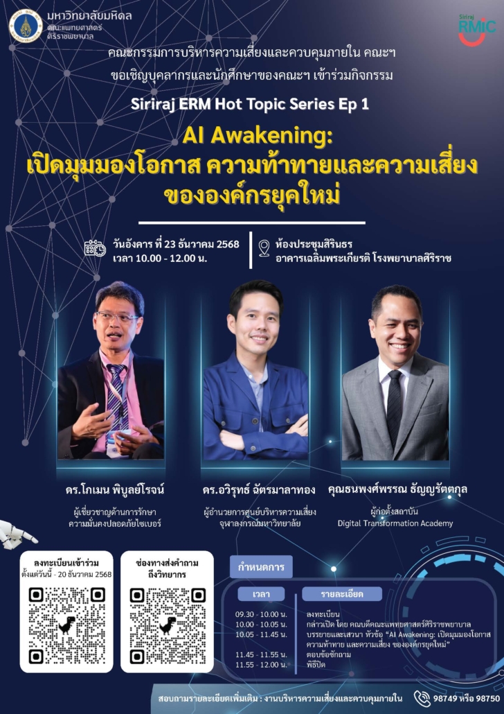 งานบริหารความเสี่ยงและควบคุมภายใน จัดโครงการเสวนา “Siriraj ERM Hot Topic Series Ep 1 – AI Awakening: เปิดมุมมองโอกาส ความท้าทาย และ ความเสี่ยง ขององค์กรยุคใหม่” ในวันที่ 23 ธันวาคม 2568 เวลา 10.00 – 12.00 น. ณ ห้องประชุมสิริธร อาคารเฉลิมพระเกียรติ ชั้น G โรงพยาบาลศิริราช