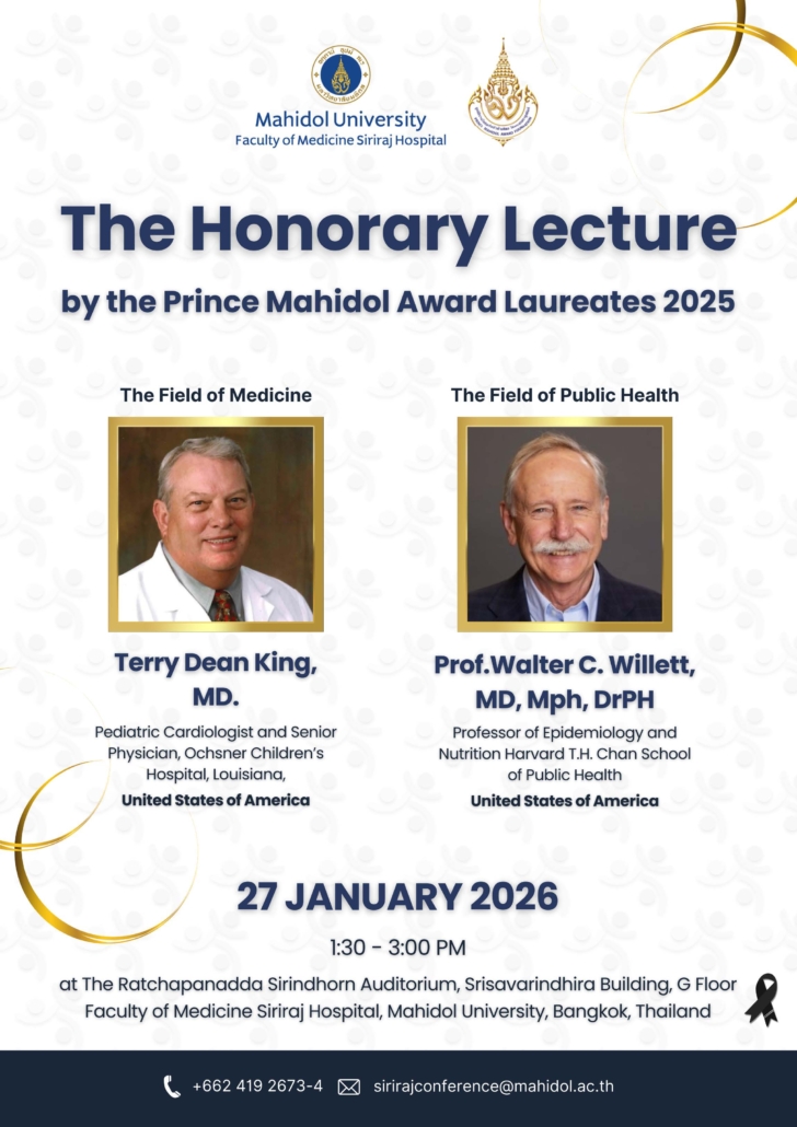 งานวิชาการ ขอเชิญบุคลากรทางการแพทย์ นักวิจัย และผู้สนใจเข้าร่วมต้อนรับและรับฟังปาฐกถาเกียรติยศ รางวัลสมเด็จเจ้าฟ้ามหิดล ประจำปี 2568 โดย “องค์ปาฐกผู้ได้รับรางวัลจาก สาขาการแพทย์ และสาขาการสาธารณสุข ประจำปี 2568” ในวันอังคาร ที่ 27 มกราคม 2569 เวลา 13.30 น. ณ ห้องประชุมราชปนัดดาสิรินธร อาคารศรีสวรินทิรา ชั้น G คณะแพทยศาสตร์ศิริราชพยาบาล