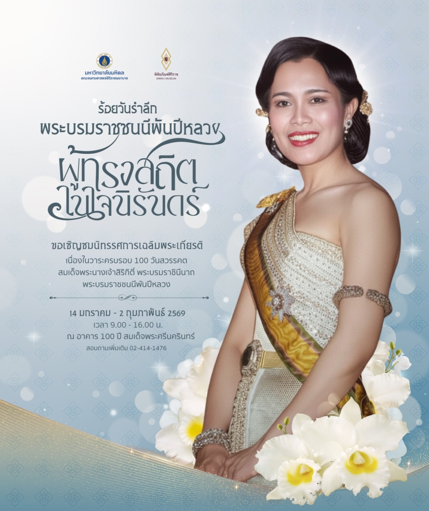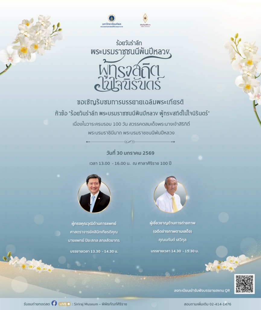 หน่วยพิพิธภัณฑ์ศิริราช ขอเชิญชมการจัดเเสดงนิทรรศการ “ร้อยวันรำลึก พระบรมราชชนนีพันปีหลวง ผู้ทรงสถิตในใจนิรันดร์” ระหว่างวันที่ 14 มกราคม – 2 กุมภาพันธ์ 2569 ณ อาคาร๑๐๐ปี สมเด็จพระศรีนครินทร์ และ บรรยายพิเศษเฉลิมพระเกียรติ ในหัวข้อ “ร้อยวันรำลึก พระบรมราชชนนีพันปีหลวง ผู้ทรงสถิตในใจนิรันดร์” เนื่องในวาระครบรอบ 100 วันสวรรคตสมเด็จพระนางเจ้าสิริกิติ์ พระบรมราชินีนาถ พระบรมราชชนนีพันปีหลวง ในวันที่ 30 มกราคม 2569 เวลา 13.00 – 16.00 น. ณ ศาลาศิริราช ๑๐๐ ปี โรงพยาบาลศิริราช สอบถามข้อมูลเพิ่มเติม โทร. 02 414 1476