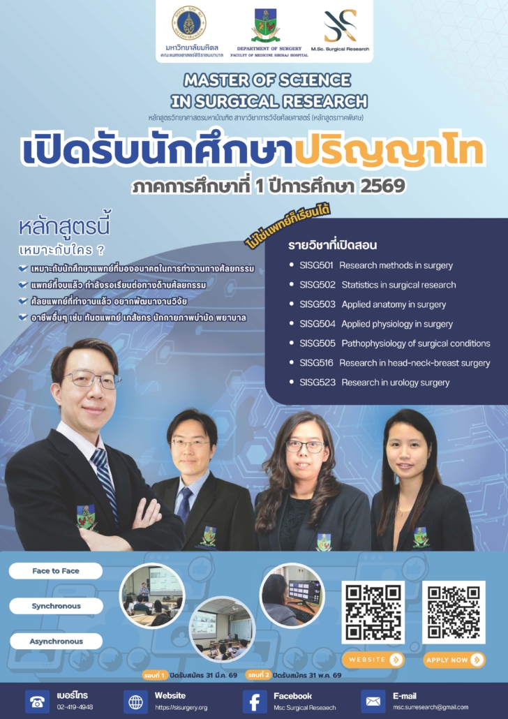 ภาควิชาศัลยศาสตร์ ขอเชิญบุคคลที่สนใจสมัครเข้าศึกษาหลักสูตรวิทยาศาสตรมหาบัณฑิต สาขาการวิจัยศัลยศาสตร์ (หลักสูตรภาคพิเศษ)
