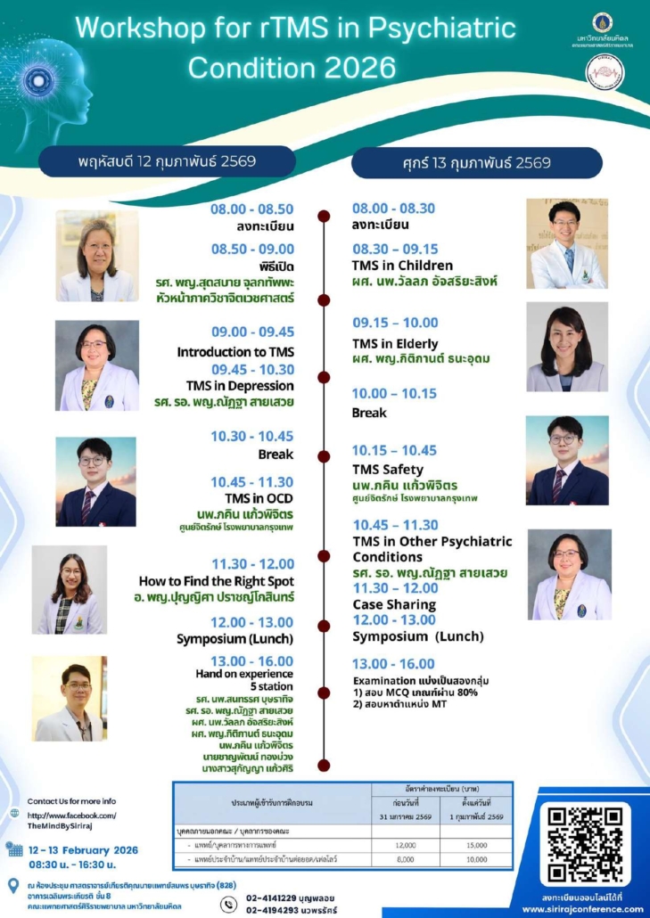 ภาควิชาจิตเวชศาสตร์ คณะแพทยศาสตร์ศิริราชพยาบาล จัดโครงการฝึกอบรมการใช้ rTMS ในภาวะทางจิตเวช (Workshop for rTMS in Psychiatric Condition 2026) ในวันพฤหัสบดีที่ 12 – วันศุกร์ที่ 13 กุมภาพันธ์ 2569 เวลา 08.00 – 16.00 น. ณ ห้องประชุม 828 ภาควิชาจิตเวชศาสตร์ อาคารเฉลิมพระเกียรติ 8 คณะแพทยศาสตร์ศิริราชพยาบาล ม.มหิดล
