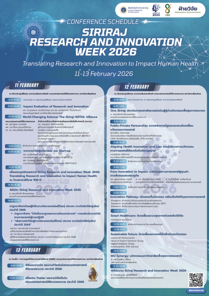 ฝ่ายวิจัย ร่วมกับศูนย์ขับเคลื่อนงานนวัตกรรมเพื่อความเป็นเลิศ คณะแพทยศาสตร์ศิริราชพยาบาล ขอเชิญร่วมงาน Siriraj Research and Innovation Week 2026: Translating Research and Innovation to Impact Human Health ระหว่างวันที่ 11 – 13 กุมภาพันธ์ พ.ศ. 2569 ณ คณะแพทยศาสตร์ศิริราชพยาบาล
