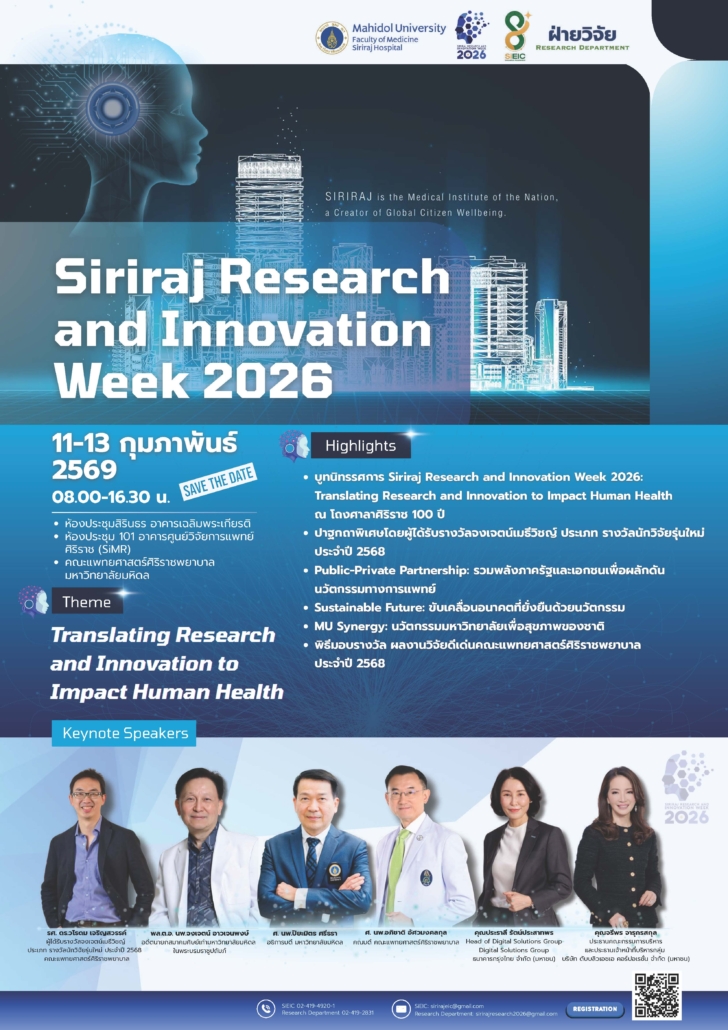 ฝ่ายวิจัย ร่วมกับศูนย์ขับเคลื่อนงานนวัตกรรมเพื่อความเป็นเลิศ คณะแพทยศาสตร์ศิริราชพยาบาล ขอเชิญร่วมงาน Siriraj Research and Innovation Week 2026: Translating Research and Innovation to Impact Human Health ระหว่างวันที่ 11 – 13 กุมภาพันธ์ พ.ศ. 2569 ณ คณะแพทยศาสตร์ศิริราชพยาบาล