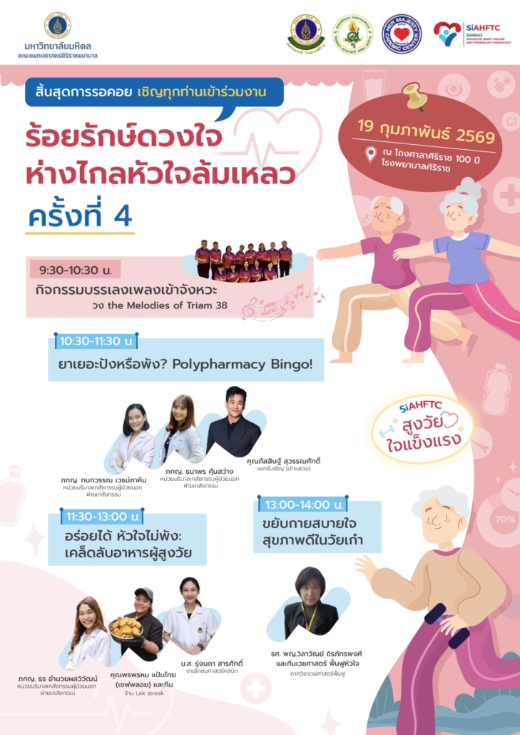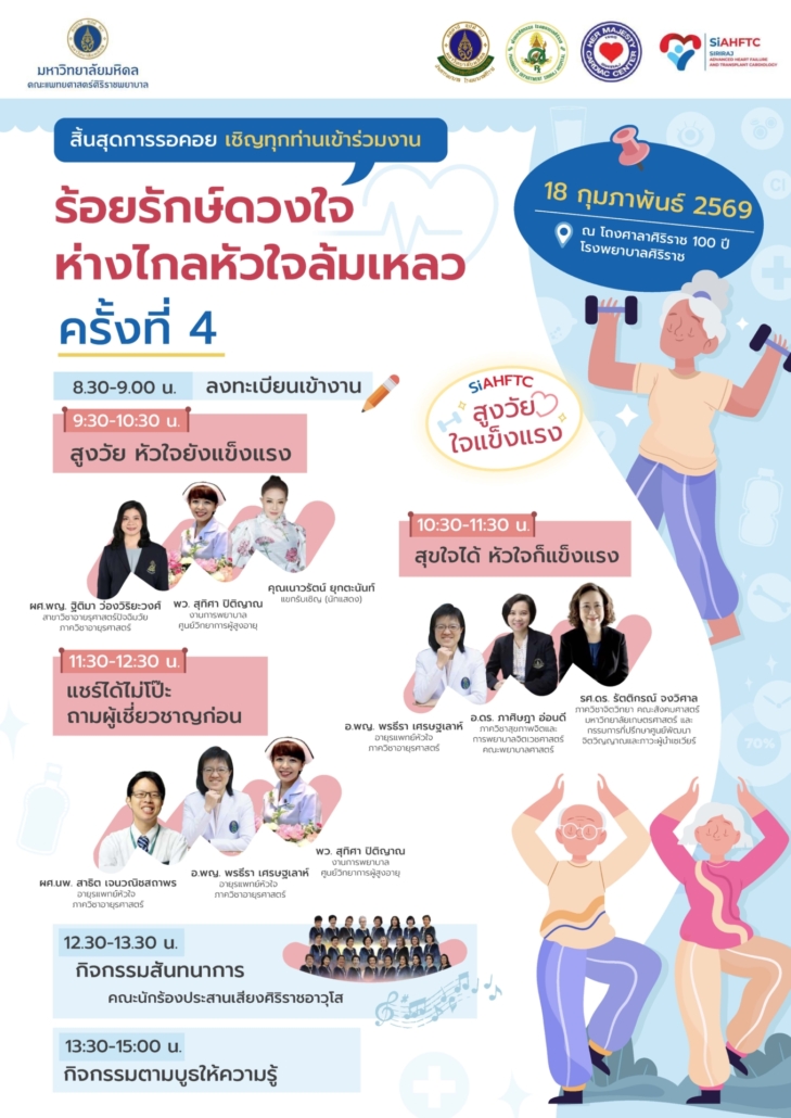 กลุ่มงานภาวะหัวใจล้มเหลว สาขาวิชาหทัยวิทยา ภาควิชาอายุรศาสตร์ ร่วมกับ งานการพยาบาลอายุรศาสตร์และจิตเวชศาสตร์ ฝ่ายการพยาบาล และฝ่ายเภสัชกรรม คณะแพทยศาสตร์ศิริราชพยาบาล ขอเชิญเข้าร่วมกิจกรรมโครงการด้านกิจกรรมเพื่อสังคม (CSR Siriraj) “ร้อยรักษ์ดวงใจ ห่างไกลหัวใจล้มเหลว” ครั้งที่ 4 ระหว่างวันที่ 18-19 กุมภาพันธ์ 2569 เวลา 09.00-15.00 น. ณ ศาลาศิริราช ๑๐๐ ปี โรงพยาบาลศิริราช