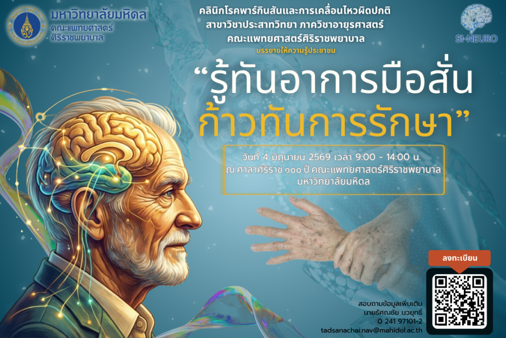สาขาวิชาประสาทวิทยา ภาควิชาอายุรศาสตร์ ขอเชิญเข้าร่วมงานบรรยายความรู้เพื่อประชาชน เรื่อง “รู้ทันอาการมือสั่น ก้าวทันการรักษา” ในวันที่ 4 มิถุนายน 2569 เวลา 09.00 – 14.00 น. ณ ศาลาศิริราช ๑๐๐ ปี โรงพยาบาลศิริราช