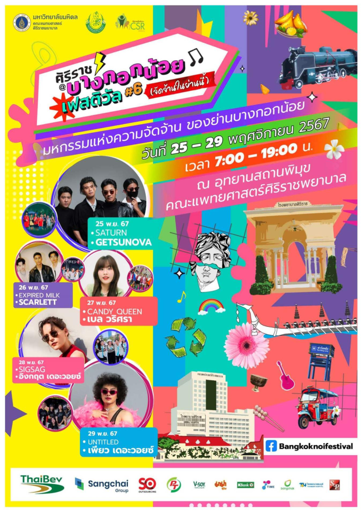 งานกิจกรรมเพื่อสังคม ขอเชิญชวนร่วมงาน “ศิริราช @บางกอกน้อยเฟสติวัล ครั้งที่ 6” (จัดจ้านในย่านนี้) ภายใต้แนวคิด “สามัญประจำย่าน” ย่านดียืนหนึ่งยาวนานกว่า 136 ปี งานเฟสติวัลสุดยิ่งใหญ่ที่รวมเอาทุกความสนุกมาไว้ในที่เดียว เพื่อสร้างความร่วมมือและความสัมพันธ์อันดีระหว่างชุมชนเขตบางกอกน้อย พร้อมกระตุ้นเศรษฐกิจ ส่งเสริมการท่องเที่ยว และสร้างบรรยากาศแห่งความสุขร่วมกัน ระหว่างวันที่ 25 – 29 พฤศจิกายน 2567 เวลา 07.00 – 19.00 น. ณ อุทยานสถานพิมุข เเละ บริเวณลานพระราชานุสาวรีย์สมเด็จพระมหิตลาธิเบศร อดุลยเดชวิกรม พระบรมราชชนก โรงพยาบาลศิริราช
