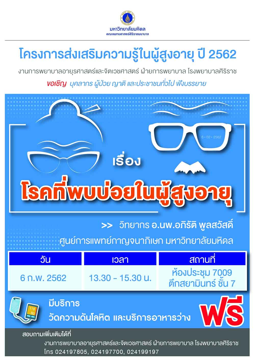 งานการพยาบาลอายุรศาสตร์และจิตเวชศาสตร์ ฝ่ายการพยาบาล โรงพยาบาลศิริราช ขอเชิญบุคลากรและประชาชนทั่วไปที่สนใจเข้าร่วมฟังการบรรยายความรู้สู่ประชาชน เรื่อง “โรคที่พบบ่อยในผู้สูงอายุ” โดย อ.นพ.อภิรัติ พูลสวัสดิ์ ศูนย์การแพทย์กาญจนาภิเษก มหาวิทยาลัยมหิดล ในวันที่ 6 กุมภาพันธ์ 2562 เวลา 13.30 - 15.30 น. ณ ห้องประชุม 7009 ตึกสยามินทร์ ชั้น 7 (ฟรี ไม่เสียค่าใช้จ่าย) สนใจติดต่อสอบถามข้อมูล ได้ที่ สอบถามเพิ่มเติม โทร. 02419 7805, 0 2419 7700, 0 2419 9197