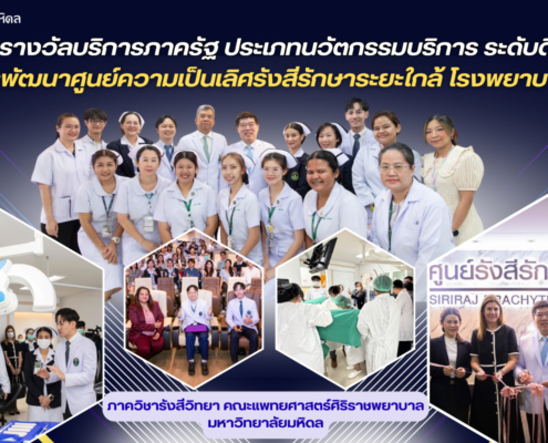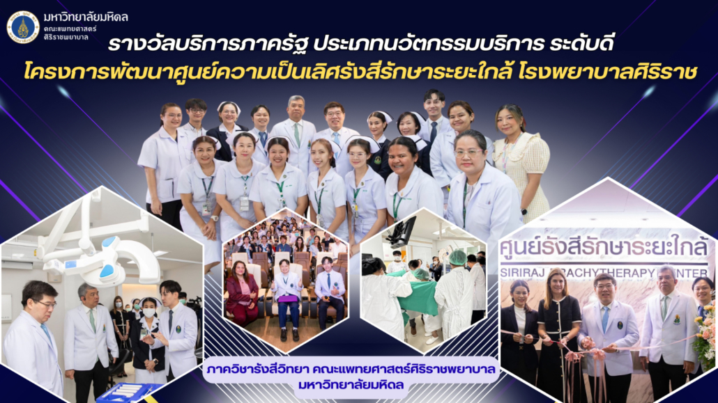 ​คณะแพทยศาสตร์ศิริราชพยาบาล มหาวิทยาลัยมหิดล ขอแสดงความยินดีกับ ภาควิชารังสีวิทยา ในโอกาสที่ผลงาน “โครงการพัฒนาศูนย์ความเป็นเลิศรังสีรักษาระยะใกล้ โรงพยาบาลศิริราช” ได้รับรางวัลเลิศรัฐ ประจำปี 2568 ประเภทนวัตกรรมการบริการ ระดับดี ซึ่งเป็นรางวัลอันทรงเกียรติที่มอบให้แก่หน่วยงานภาครัฐที่มีความเป็นเลิศ โดยมี รศ. นพ.พิทยา ด่านกุลชัย หัวหน้าสาขาวิชารังสีรักษา ภาควิชารังสีวิทยา และงานการพยาบาลรังสีวิทยา ฝ่ายการพยาบาล โรงพยาบาลศิริราช เป็นผู้รับผิดชอบโครงการ