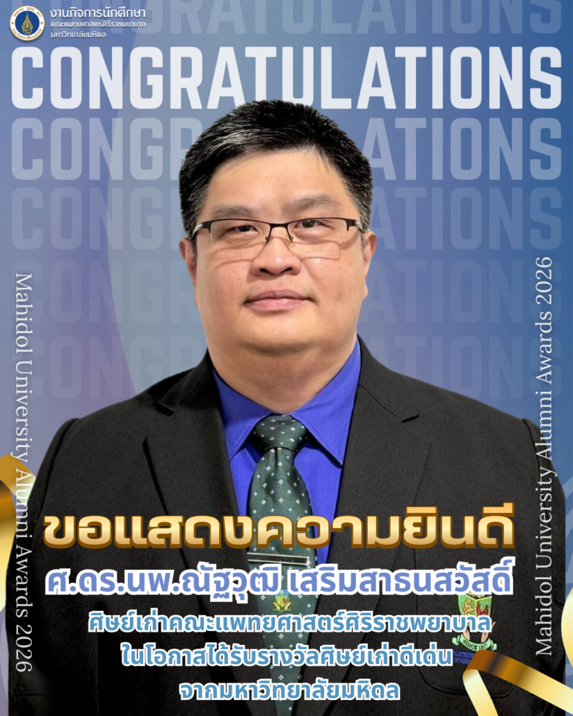 – ศ. ดร. นพ.ณัฐวุฒิ เสริมสาธนสวัสดิ์ ภาควิชาศัลยศาสตร์ ได้รับรางวัลศิษย์เก่าดีเด่น Mahidol University Alumni Awards 2026