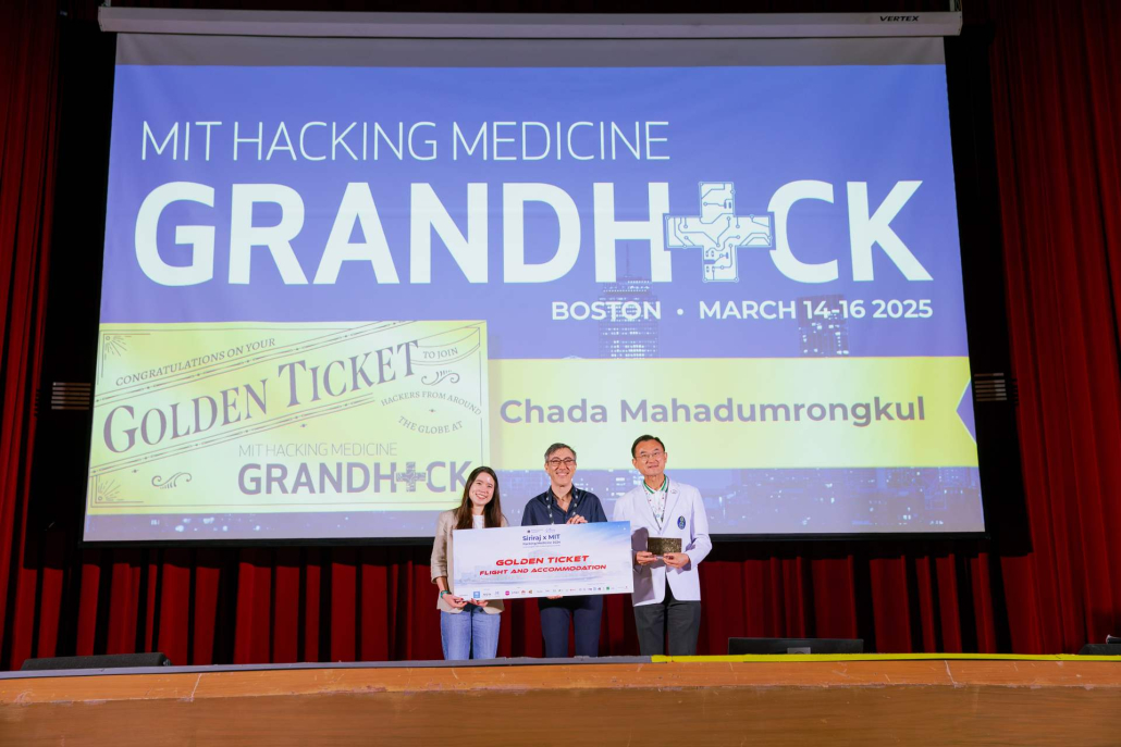 รางวัลสูงสุดของงาน Siriraj x MIT Hackathon คือ “Golden Ticket” สู่การแข่งขัน MIT Grand Hack 2025 ณ เมืองบอสตัน รัฐแมสซาชูเซตส์ สหรัฐอเมริกาอันทรงเกียรติ โดยผู้ชนะ 3 ท่านที่ได้รับรางวัลนี้ ได้แก่ คุณธีรธาดา จินดาชะโป คุณชฎา มหาดำรงค์กุล และ คุณณัฐชลินท์ เคนถาวร