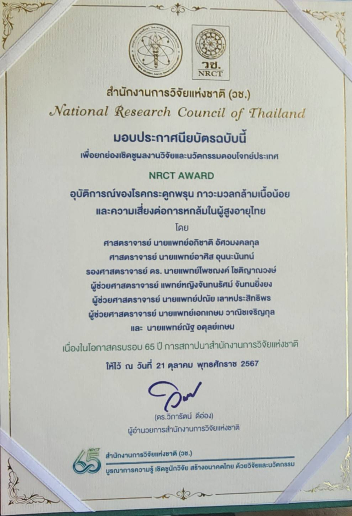 คณะแพทยศาสตร์ศิริราชพยาบาล มหาวิทยาลัยมหิดล ขอแสดงความยินดีกับ ผลงานวิจัย เรื่อง อุบัติการณ์ของโรคกระดูกพรุน ภาวะมวลกล้ามเนื้อน้อย และความเสี่ยงต่อการหกล้มในผู้สูงอายุไทย ใน”โครงการวิจัยท้าทายไทย” หรือ “โครงการสำรวจสุขภาวะโรคกระดูกและข้อในผู้สูงอายุของประเทศไทย” ของภาควิชาศัลยศาสตร์ออร์โธปิดิคส์เเละกายภาพบำบัด ในโอกาสได้รับรางวัล ผลงานวิจัยและนวัตกรรมตอบโจทย์ประเทศ NRCT AWARD ในงานครบรอบ 65 ปี การสถาปนาสำนักงานการวิจัยแห่งชาติ (วช.) โดยมี รศ. ดร. นพ.โพชฌงค์ โชติญาณวงษ์ และทีมนักวิจัย เป็นตัวแทนเข้ารับมอบรางวัล เมื่อวันจันทร์ที่ 21 ตุลาคม 2567 ณ ห้องประชุมจอมพลสฤษดิ์ ธนะรัชต์ อาคาร วช.1 สำนักงานการวิจัยแห่งชาติ (วช.)
