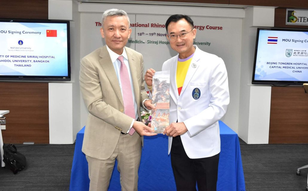 วันที่ 18 พฤศจิกายน 2567 ศาสตราจารย์ นายแพทย์อภิชาติ อัศวมงคลกุล คณบดีคณะแพทยศาสตร์ศิริราชพยาบาล มหาวิทยาลัยมหิดล และ Professor Zhang Luo, MD, PhD, President of the Beijing Tongren Hospital affiliated to Capital Medical University, Beijing, People’s Republic of China, presided over the signing ceremony of a “Memorandum of Understanding on Academic and Educational Exchange.” เพื่อส่งเสริมความร่วมมือด้านการศึกษา การวิจัย และการบริการทางวิชาการ รวมถึงการแลกเปลี่ยนวิชาการและการศึกษา เพื่อประโยชน์ร่วมกันของทั้งสองสถาบัน โอกาสนี้ ผู้ช่วยศาสตราจารย์ นายแพทย์ศรัญ ประกายรุ้งทอง หัวหน้าภาควิชาโสต นาสิก ลาริงซ์วิทยา รองศาสตราจารย์ ดร. นายเเพทย์พงศกร ตันติลีปิกร ร่วมเป็นสักขีพยานในพิธีลงนาม ณ กรุงปักกิ่ง สาธารณรัฐประชาชนจีน